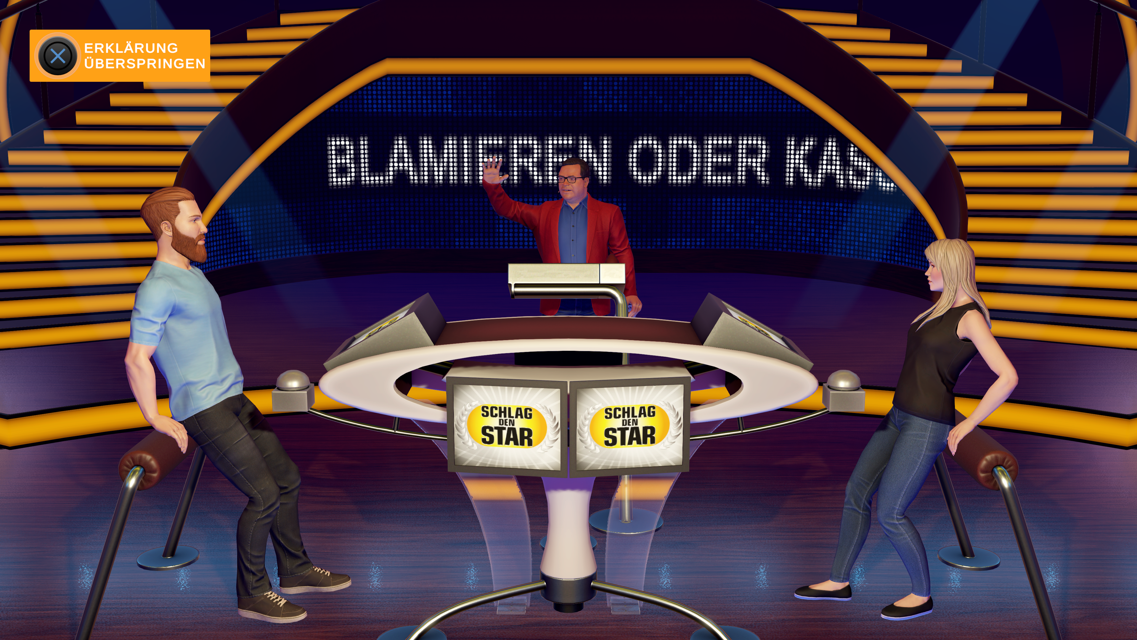 Ein abwechslungsreicher Mix aus insgesamt 20 Action- und Quiz-Games bilden die Grundlage für eine 15 Runden andauernde „TV-Show“. Für Spielerinnen und Spieler, die es doch etwas eiliger haben, steht der Modus „Halbe Show“ mit sieben Spielen zur Verfügung. Für den noch schnelleren Erfolg gibt es den Modus „Best of Three“, in dem nur diejenigen gewinnen, die zuerst drei Spiele erfolgreich absolvieren können. Gemäß dem Vorbild führt auch bei SCHLAG DEN STAR – DAS 2. SPIEL kein Geringerer als ELTON die Teilnehmerinnen und Teilnehmer durch die Spiel-Show.